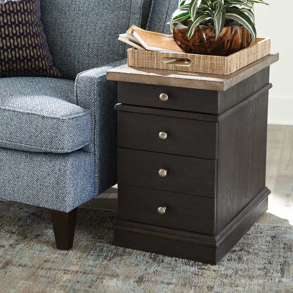Blending rustic charm with modern convenience, the Hancock Charging Chairside Table features cathedral grain white oak in a casual two-tone finish, enhanced by a hand-antiqued application for a relaxed, timeless appeal. Designed for functionality, it discreetly houses an integrated electrical outlet, making it easy to charge devices while maintaining a clean aesthetic. Compact yet stylish, this versatile piece seamlessly complements any space, offering a perfect balance of warmth, character, and practicality.